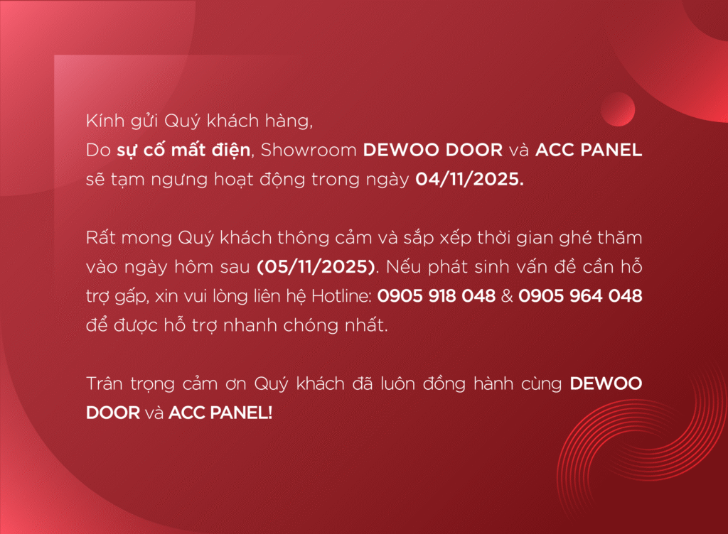 Do sự cố mất điện, Showroom ACC Panel & DEWOO Door tại 102 Võ Chí Công, Hòa Xuân, Đà Nẵng sẽ tạm ngưng hoạt động trong ngày 04/11/2025.